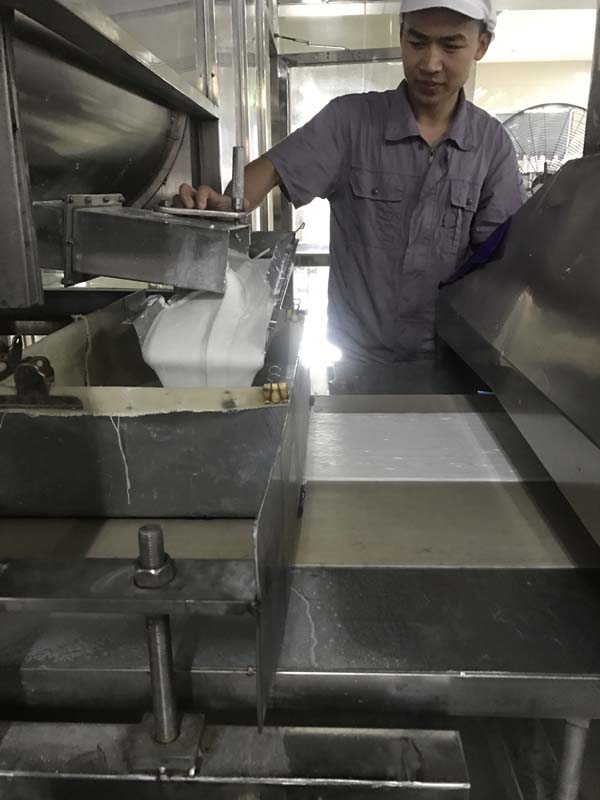 布好漿的網(wǎng)帶自動進入蒸粉機,將米漿蒸熟成米粉片;